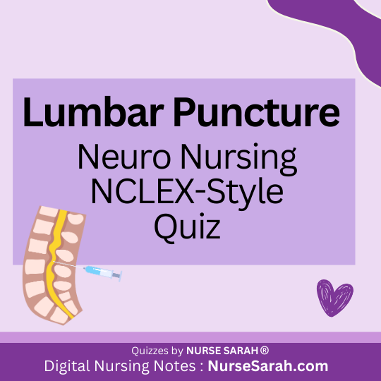 Test your knowledge on lumbar puncture (LP), also called a spinal tap, procedures with this NCLEX-style quiz designed for nursing students and healthcare professionals. These questions cover key aspects of lumbar puncture care, including needle insertion sites, pre-procedure lab checks, medication precautions, patient positioning, interpretation of CSF opening pressure, and post-procedure interventions. Don’t forget to […]